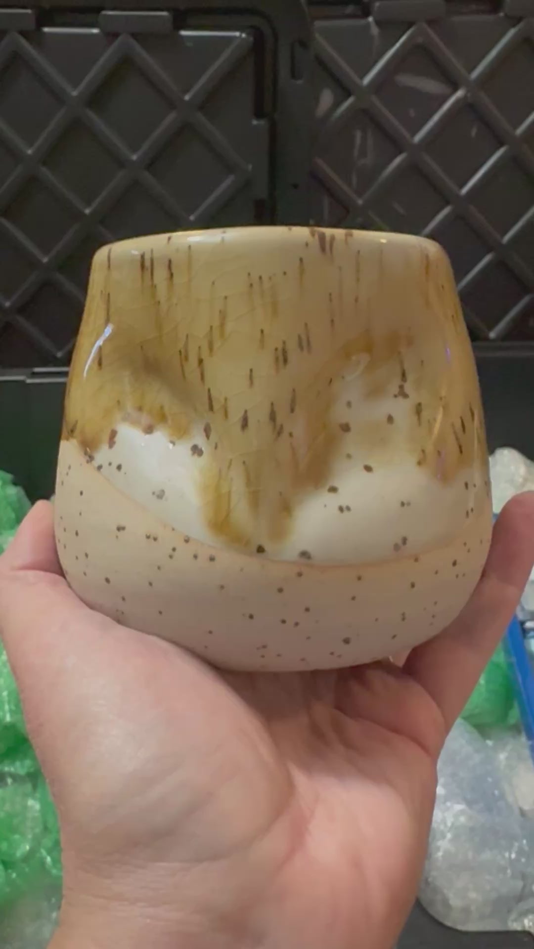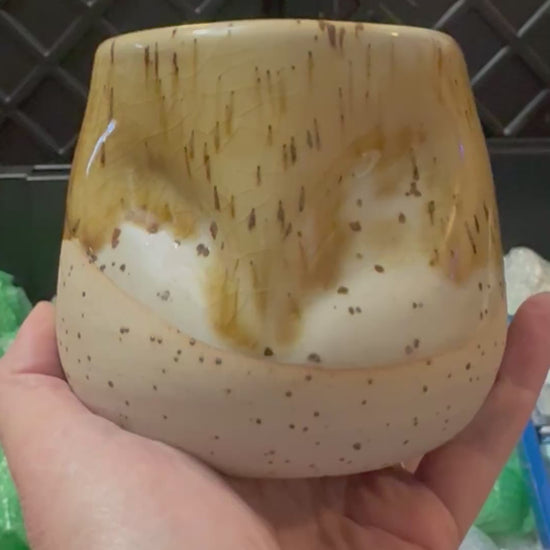 This hand thrown piece is inspired by the beautiful barn owl I met in Vermont on a Falconry experience. This white stoneware clay was mixed with granite sand from Crescent beach in Cape Elizabeth, Maine, creating the iron spots with the amber crowd on glaze. Fired to cone 10.